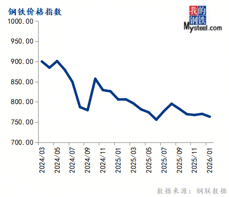 1月份钢铁价格指数为763.27,环比下跌0.91%,同比下跌5.31%。