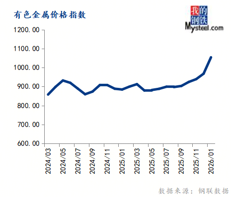 1月份有色金属价格指数为1053.84,环比上涨8.92%,同比上涨19.16%。