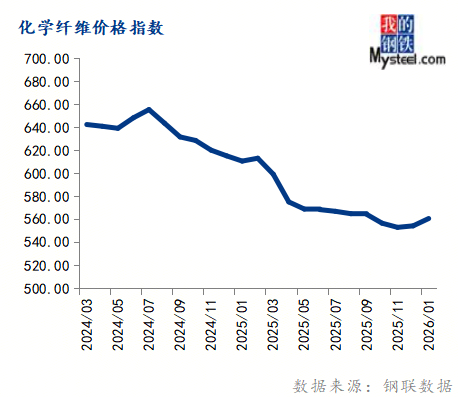 1月份化学纤维价格指数为560.76,环比上涨1.15%,同比下跌8.18%。