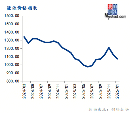 1月份能源价格指数为1071.09,环比下跌4.78%,同比下跌9.23%。